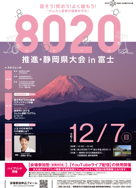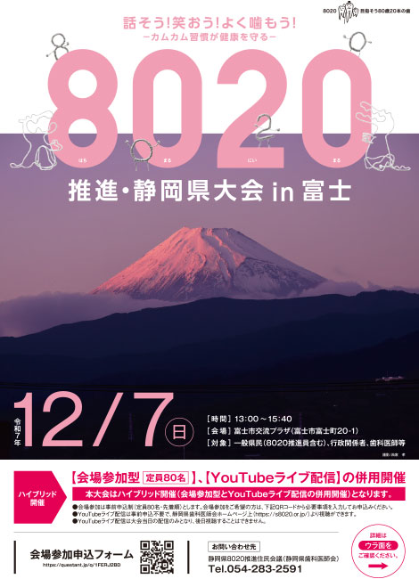8020推進・静岡県大会 8020推進・静岡県大会in富士 令和7年12月7日 13時00分~ YouTubeライブ配信! 来場参加希望の方はこちらからお申し込みください ポスター・案内ダウンロード ポスター PDF ダウンロード ≫ 案内 PDF ダウンロード ≫